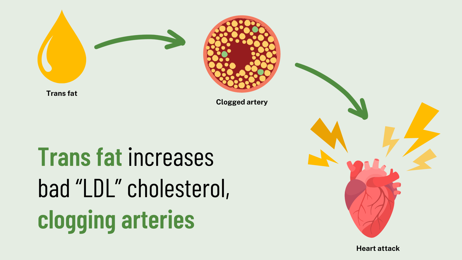 Consumption of trans-fatty acids (TFA) increases the risk of heart attacks and death from coronary heart disease. Industrially-produced TFA is used in baked and fried foods, pre-packaged snacks, and certain cooking oils and fats used at home, in restaurants or in street food.