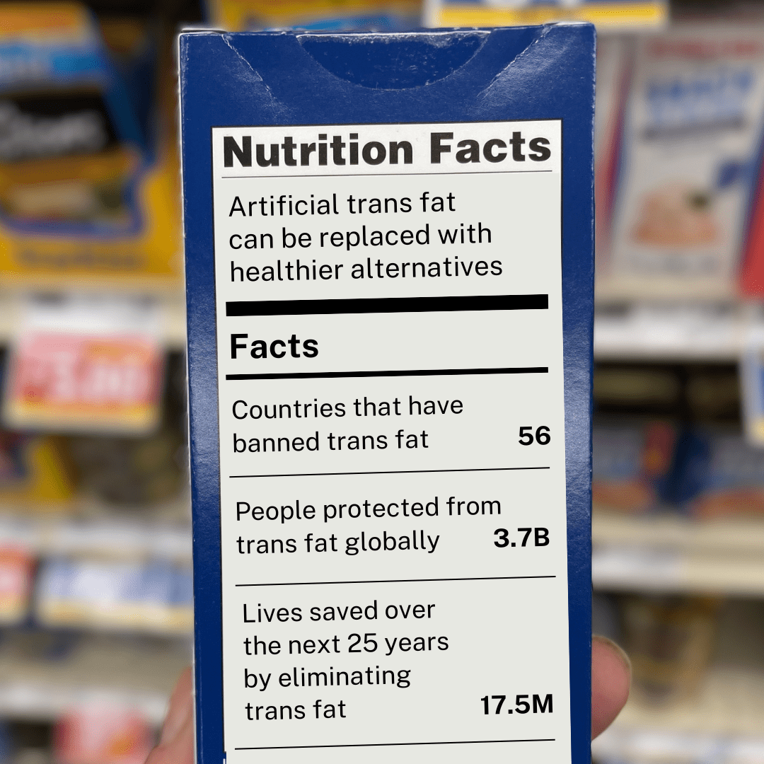 - Every day in [country], people consume harmful trans fat without knowing it. This year, trans fat will cause [insert number] deaths.