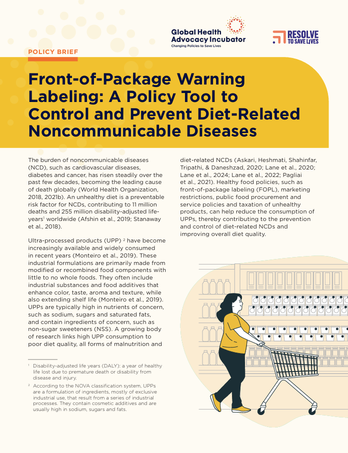 This policy brief developed by Global Health Advocacy Incubator (GHAI) and Resolve to Save Lives highlights the critical role of mandatory front-of-package warning labeling (FOPL or FOPWL) in combating diet-related noncommunicable diseases (NCDs) such as diabetes, cardiovascular diseases, and obesity and saving millions in health care costs. Warning labels empower consumers with easy-to-understand nutrition information […]