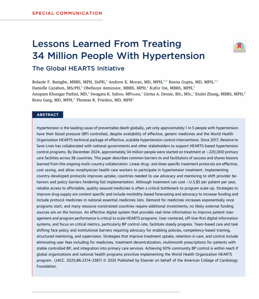Hypertension is the leading cause of preventable death globally, yet only one in five people with high blood pressure have it under control despite availability of effective, low-cost medicines and the WHO HEARTS technical package of effective, scalable hypertension control interventions. Since 2017, Resolve to Save Lives has collaborated with national governments and other stakeholders […]