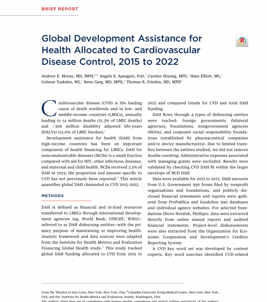 Cardiovascular disease (CVD) is the leading cause of death worldwide yet CVD prevention efforts remain starkly underfunded. A new landmark report in the Journal of the American College of Cardiology quantifies for the first time the surprising mismatch between high CVD burden and low CVD funds from high income country governments and international development agencies such […]