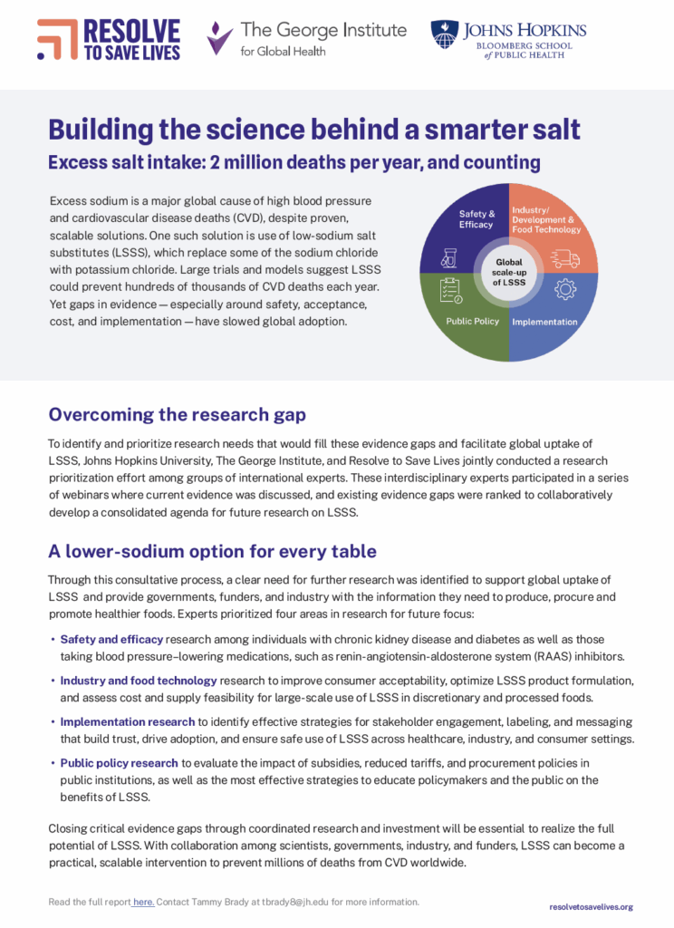 Excess sodium drives global hypertension and cardiovascular deaths, yet adoption of low-sodium salt substitutes (LSSS) remains slow despite strong evidence that they could prevent hundreds of thousands of deaths annually. To pinpoint what’s holding uptake back, Johns Hopkins University, The George Institute, and Resolve to Save Lives convened international experts to identify the most urgent […]