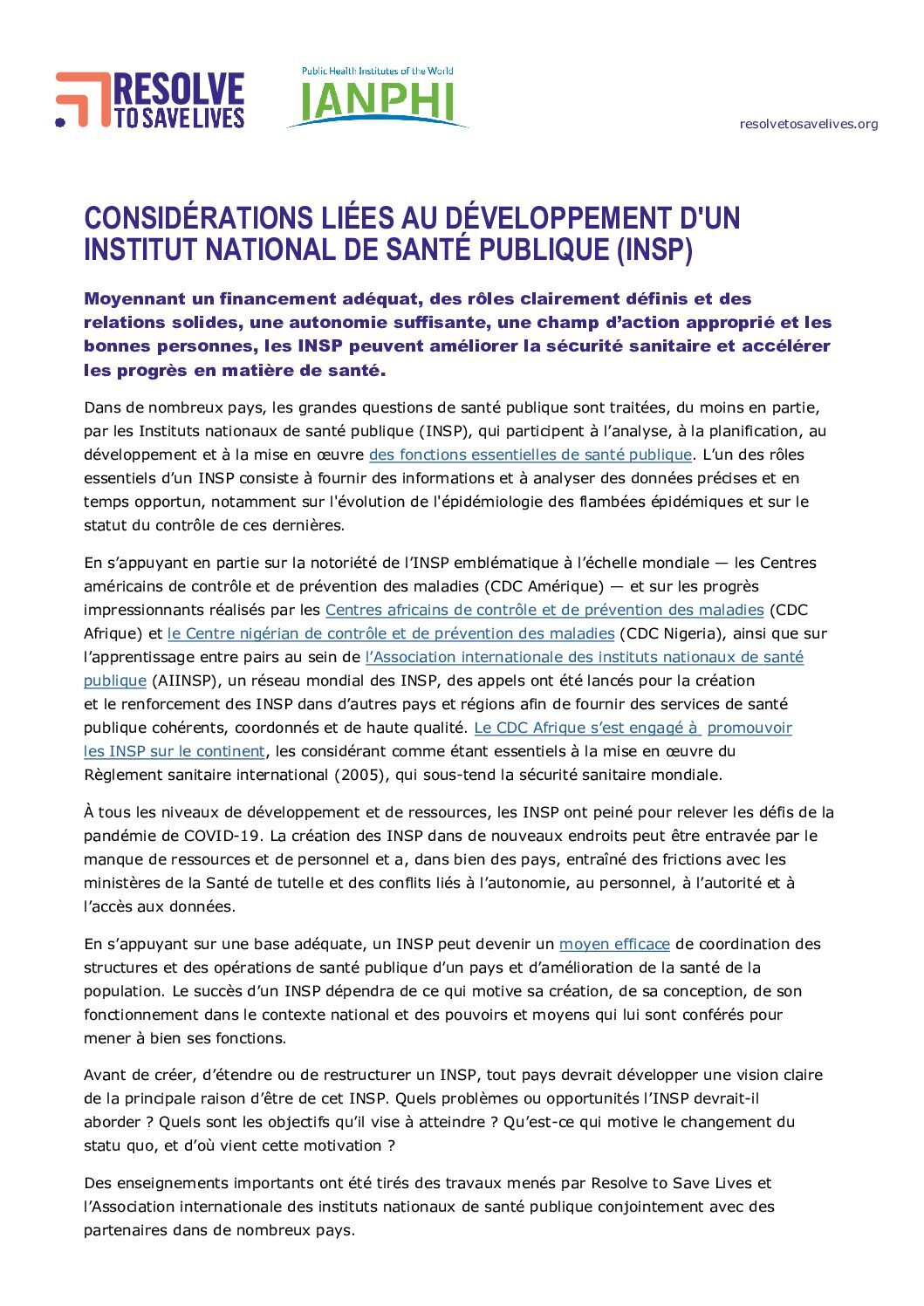 Ensiegnements et recommandations tirés des travaux menés par Resolve to Save Lives et l’Association internationale des instituts nationaux de santé publique conjointement avec des partenaires dans de nombreux pays.
