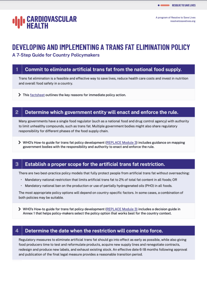 Fact sheet from Resolve to Save Lives with practical steps for countries to develop and implement best practice trans fat elimination policies