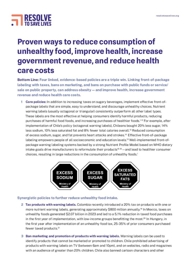 Four linked, evidence-based policies are a triple win: Linking front-of-package labeling with taxes, bans on marketing, and bans on purchase with public funds or service/sale on public property, can address obesity — and improve health, increase government, revenue and reduce health care costs.