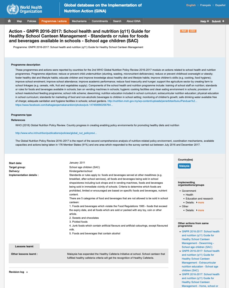 Standards for foods and beverages served and sold in Malaysian schools. News article on implementation of nutrition standards: Rajaendram R. Ensuring children chomp on healthy treats. The Star Malaysia. 2018 Jan 21. Education.