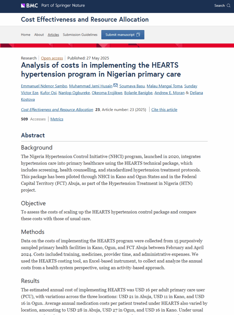 A new article co-authored by Resolve to Save Lives dives into the cost of scaling up HEARTS hypertension services in Nigeria to help prevent and control high blood pressure, and outlines the next steps to lowering the cost of HEARTS implementation.