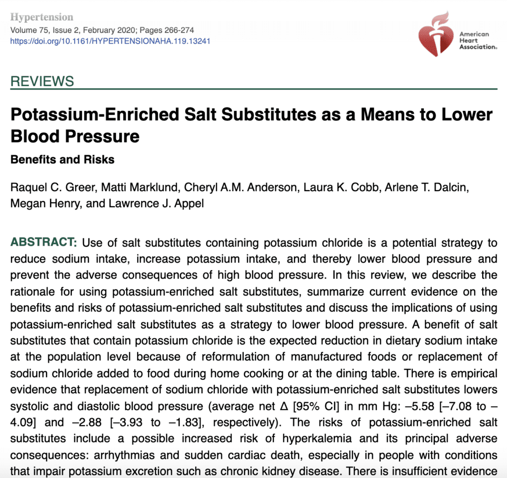 Article presenting the rationale, current evidence on benefits and risks, and implications for using potassium-enriched salt substitutes as a strategy to lower blood pressure.
