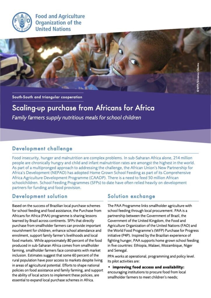 Multi-stakeholder initiative by the FAO, World Food Programme, Brazil and the UK, and the governments of each pilot country: Ethiopia, Malawi, Mozambique, Niger and Senegal, to procure food from small farms for schools.