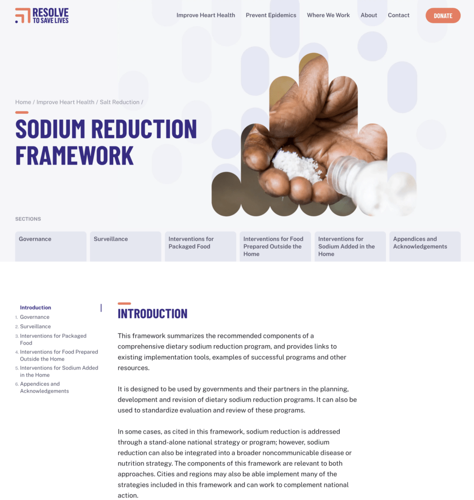 This framework summarizes the recommended components of a comprehensive dietary sodium reduction program, and provides links to existing implementation tools, examples of successful programs and other resources.