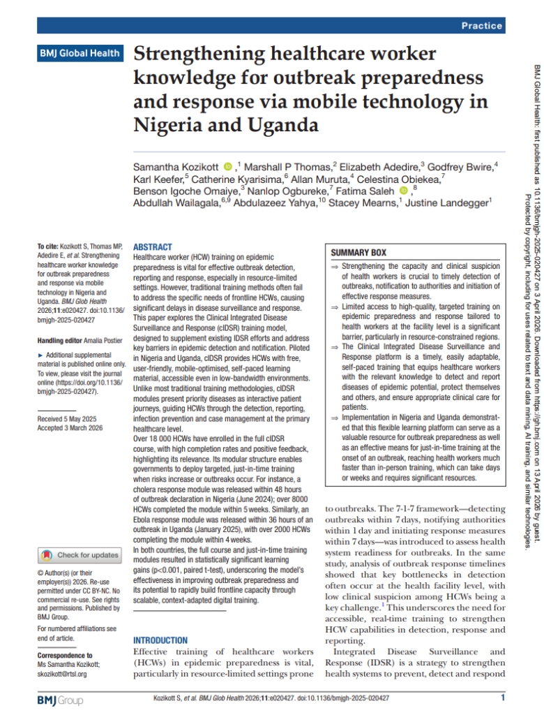 A new digital training model called Clinical Integrated Disease Surveillance and Response (cIDSR) is helping frontline workers respond faster and more effectively to disease outbreaks. This analysis from Resolve to Save Lives explains how the training overcomes the limitations of traditional training using a mobile-optimised, self-paced platform that guides health care workers through real patient scenarios covering disease detection, reporting and case management. More than 18,000 health care workers have enrolled and when cholera broke out in Nigeria in June 2024, a dedicated training module was live within 48 hours and completed by over 8,000 workers in five weeks. An Ebola module in Uganda followed similarly swift deployment in early 2025. Across both countries, the training produced statistically significant improvements in knowledge, pointing to its strong potential as a scalable, adaptable tool for building frontline epidemic preparedness.