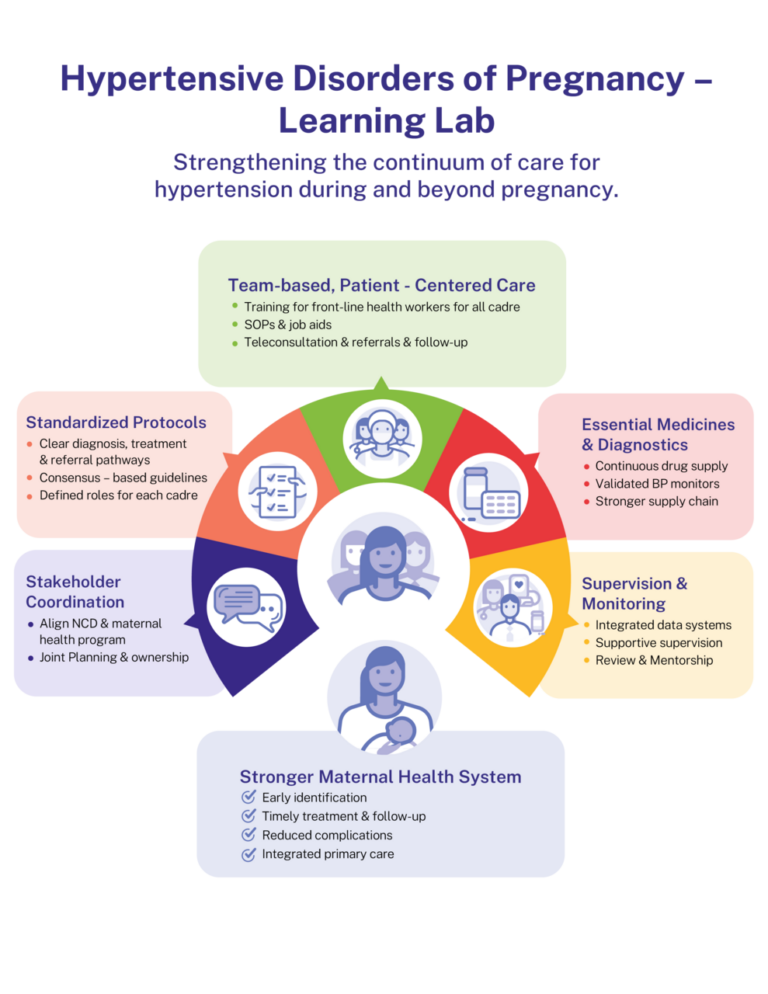 In Harda district in Madhya Pradesh, India, a pilot project on Hypertensive Disorders of Pregnancy (HDP) is helping improve how women are screened, treated, and followed up with blood pressure care during and after pregnancy. Along with providing technical guidance on a standardized treatment protocol, RTSL supported the development of a digital tool to help health workers identify women at high risk for preeclampsia and systematically capture key data elements not available on other platforms, such as ANMOL or the NP-NCD portal.