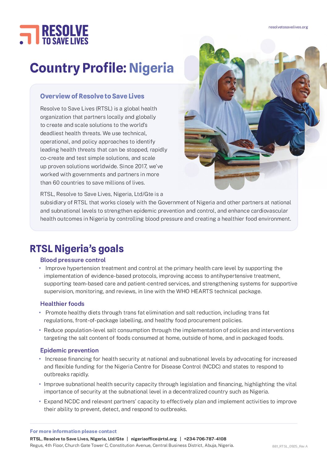 Resolve to Save Lives works closely with the Government of Nigeria and other partners at national and subnational levels to end preventable deaths from cardiovascular diseases and infectious disease outbreaks.